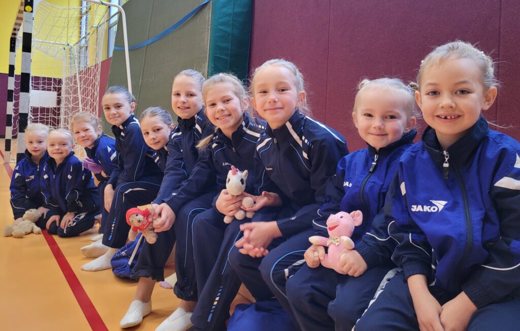 In der Ak 7 turnten Mila, Leni, Lara, Antonia und Frida. In dieser Altersklasse turnten insgesamt 9 Mannschaften. Unsere Kleinsten holten sich einen guten 6. Platz 😀